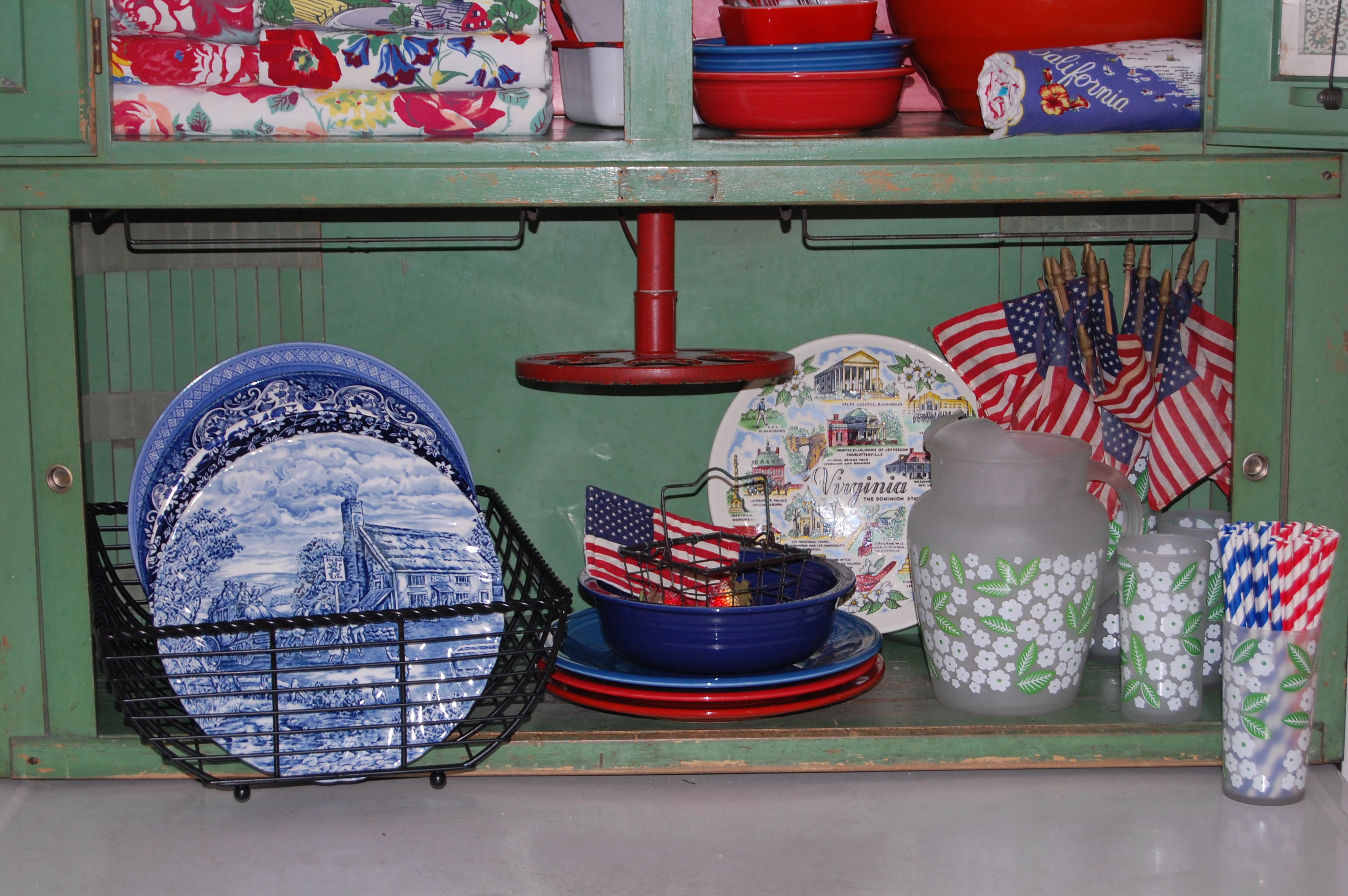 I’m getting a jump on summer decor, starting with the Hoosier cabinet. Having red, white and blue as my color scheme, I’ll leave this up from Memorial Day through Labor Day.