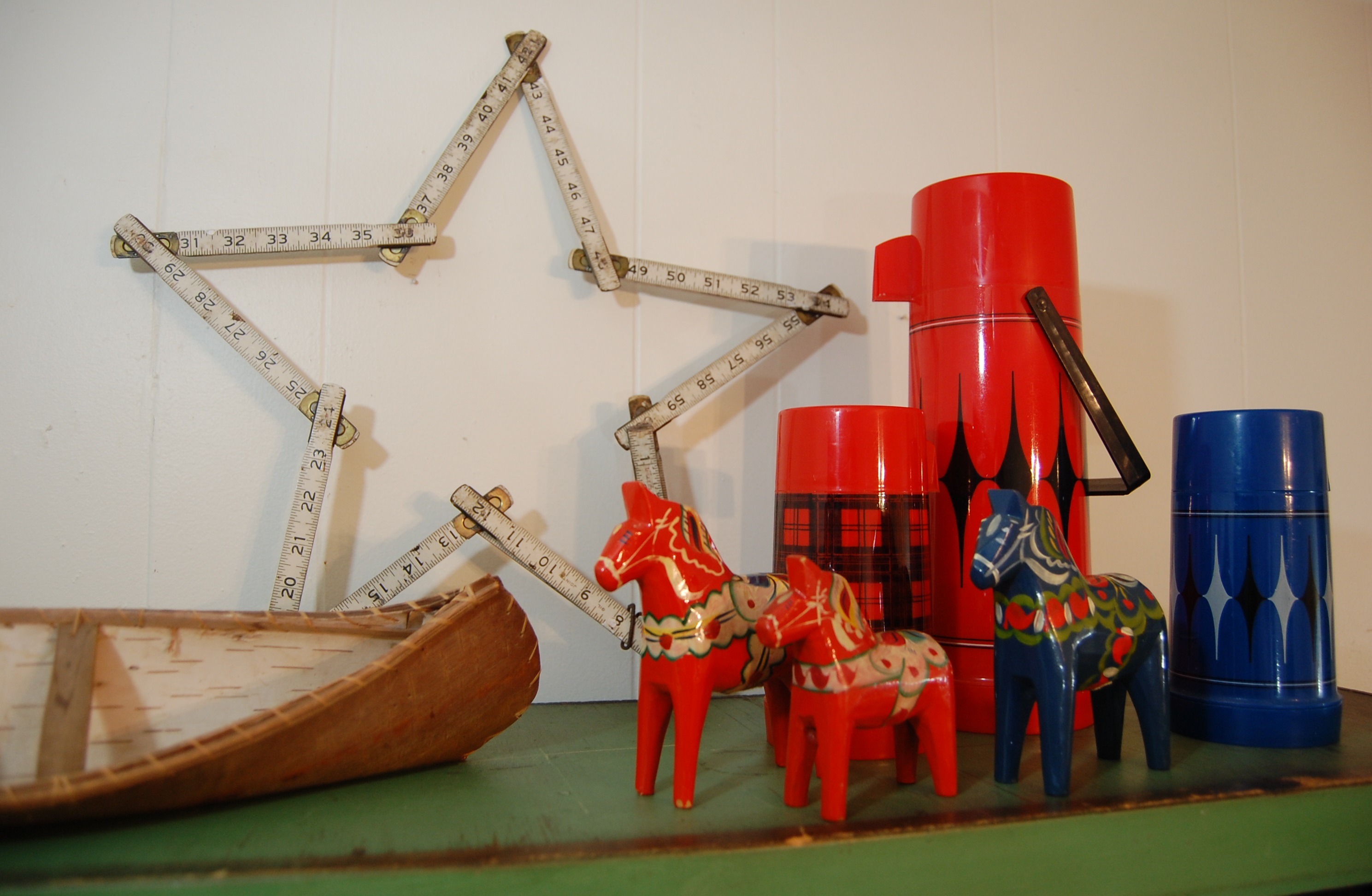 Some of these pieces are a nod to my Minnesota childhood. The birch bark canoe is a reminder of summers spent paddling on the lake. The dala horses and the Lisa Larson figurine were gifts to our family from a Swedish exchange student.