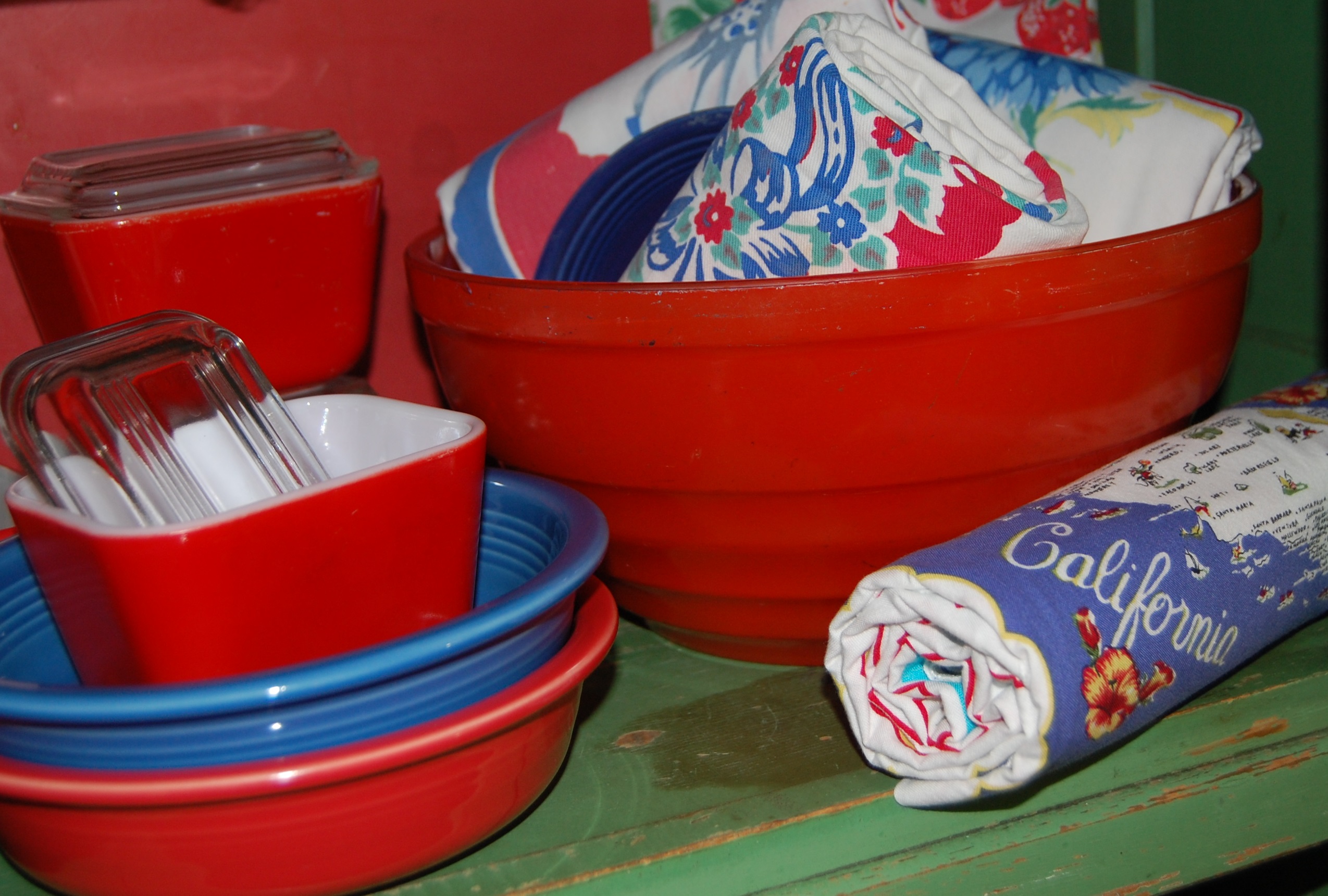 Do you see the navy saucer peeking out from the red bowl? It belonged to my Hoosier Grandma. The California cloth is in memory of my Grandparents; and with love to all my family in the Golden State. The tablecloth is a new piece made to look like vintage, state map hankies.