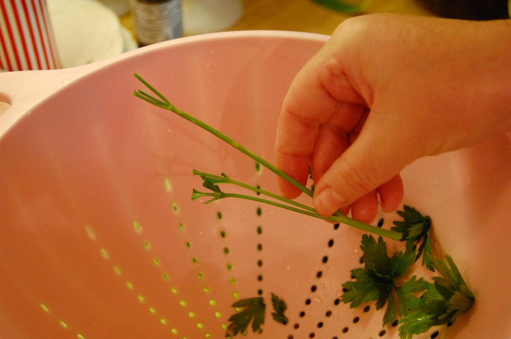 Ready to give it a try? Gather your herbs and rinse them thoroughly. Line up the end of the stem with a hole in the colander and gently pull the stem through. The leaves should stay on the inside of the colander. Rotate the colander as you work your way through the herbs. When done, simply brush the leaves onto a cutting board and chop them.