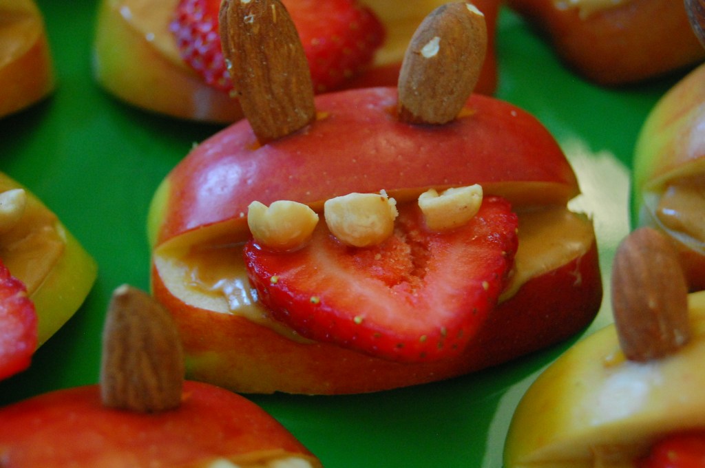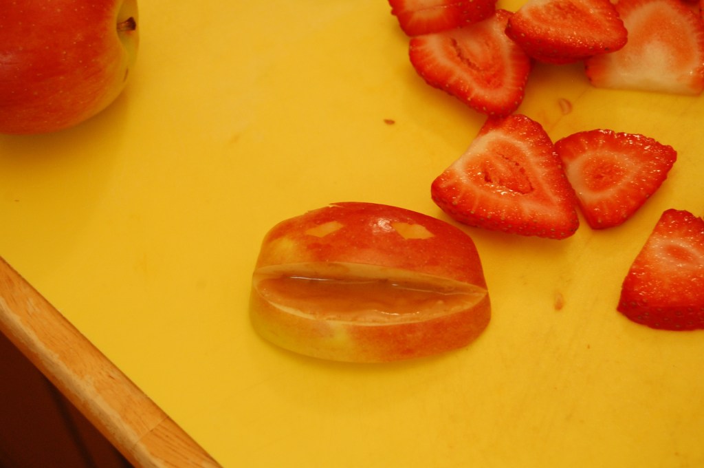 From the lower half of the apple wedge and without slicing through to the back, cut mouth openings. These should be large enough to contain peanut butter, a strawberry slice and a few peanut teeth.