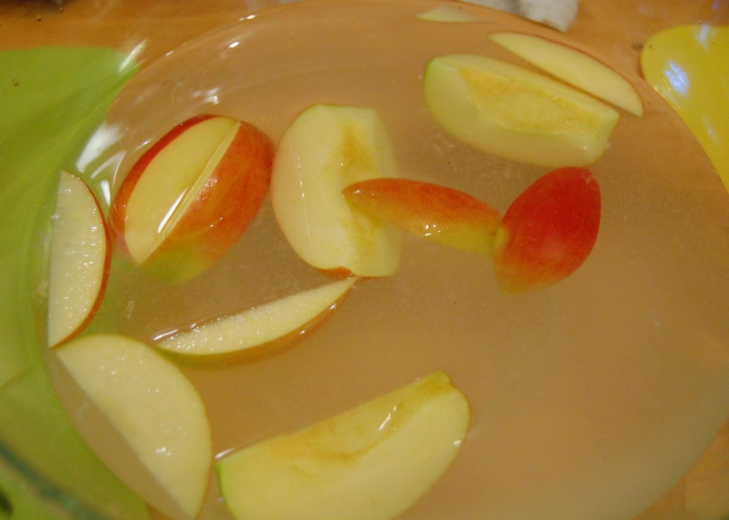 Quarter and core the apples and soak them in a solution of lemon water. I used 1 T. juice to one cup of water.