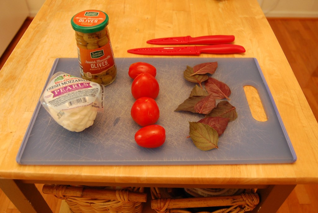 Layer each creature in order: basil leaf, tomato slice, mozzarella pearl slices and olive/pimiento slices. Serve with optional toppings of balsamic reduction, salt/pepper and extra mozzarella pearls.