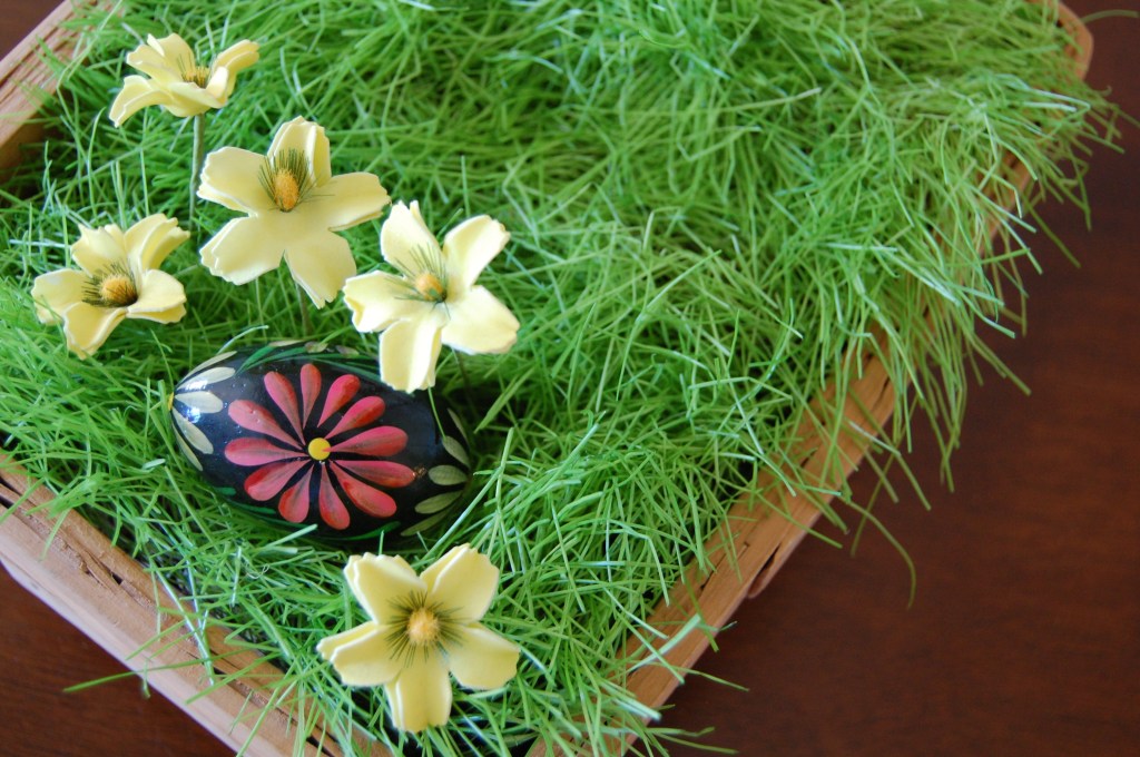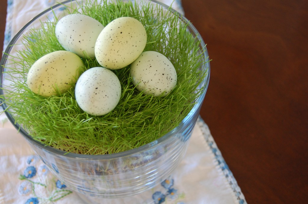 Once you’ve grown the grass, it’s time to pull out your spring decor, or shop the house for seasonal items. I’ve collected a ceramic rabbit, four different types of eggs, some plastic chicks, faux flowers and a faux bird nest.