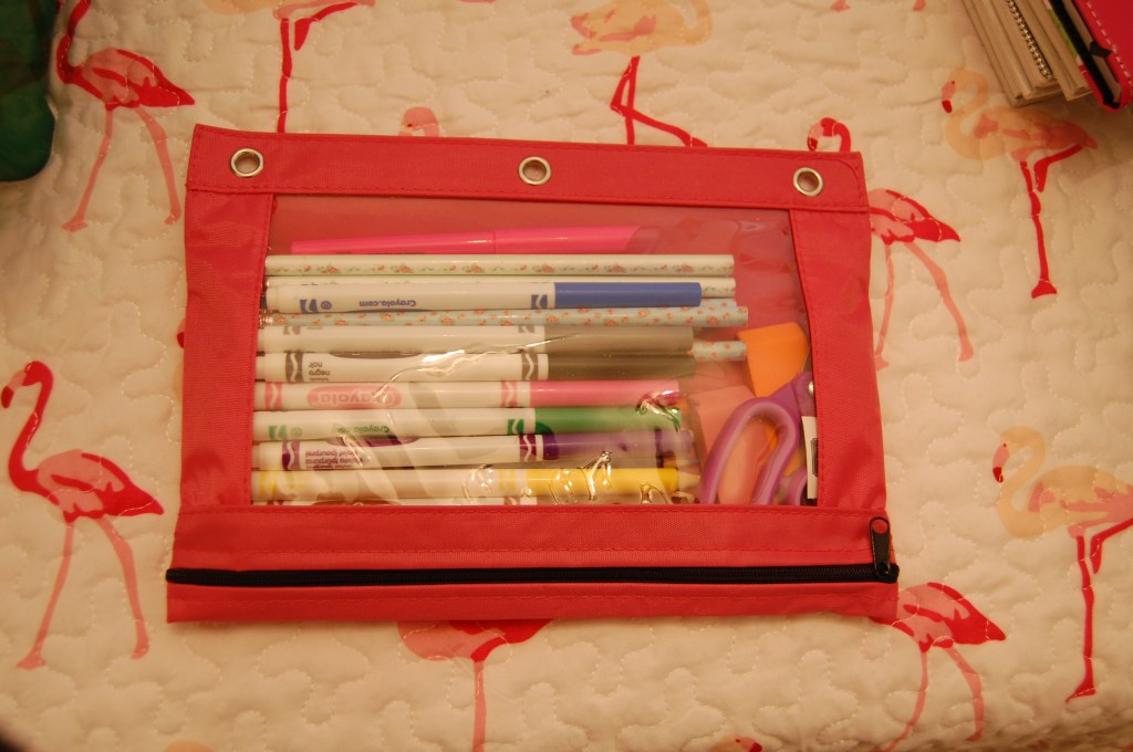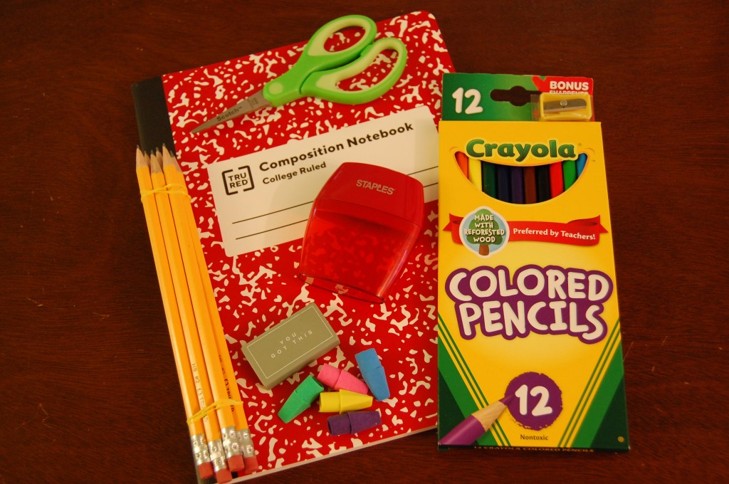 School Supplies: Composition book (college ruled for the older kiddos), colored pencils, pencils, pencils sharpener, scissors and erasers. In the interest of not shipping air, we stuff the pencil sharpener full of pencil-top erasers. Don’t you think a colorful or glittered pencil would make school work just *a little* more fun?