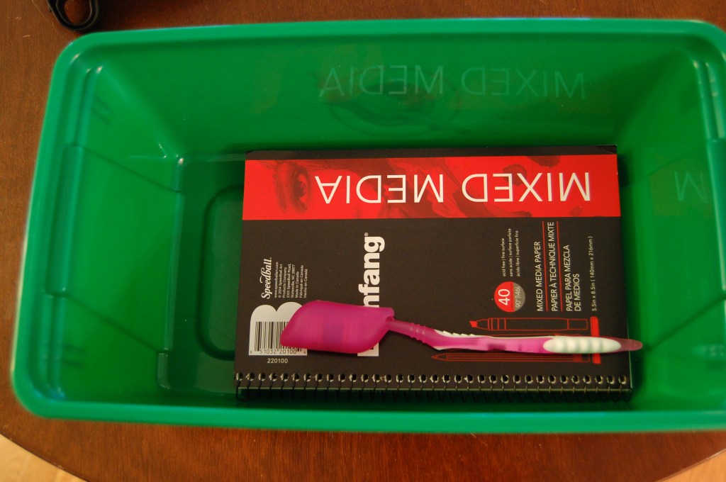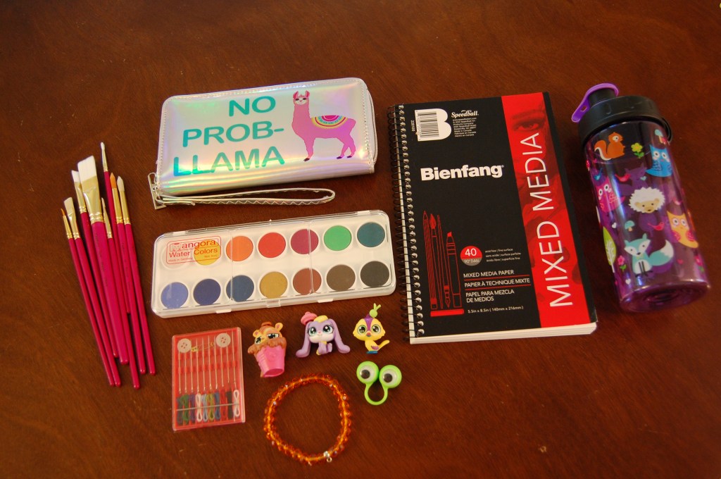 Fun Stuff: Paint brushes, watercolors, art paper, zippered wallet, travel sewing kit, beaded bracelet, water bottle and tiny trinkets.
