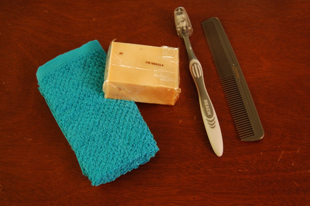Personal Care Items: Included are a washcloth, soap, toothbrush and cover, Chap-stick, nail care set, hair elastics and shower comb. We sometimes use the hair elastics to secure rolled clothing items; it’s more useful to the recipient than sending a rubber band.
