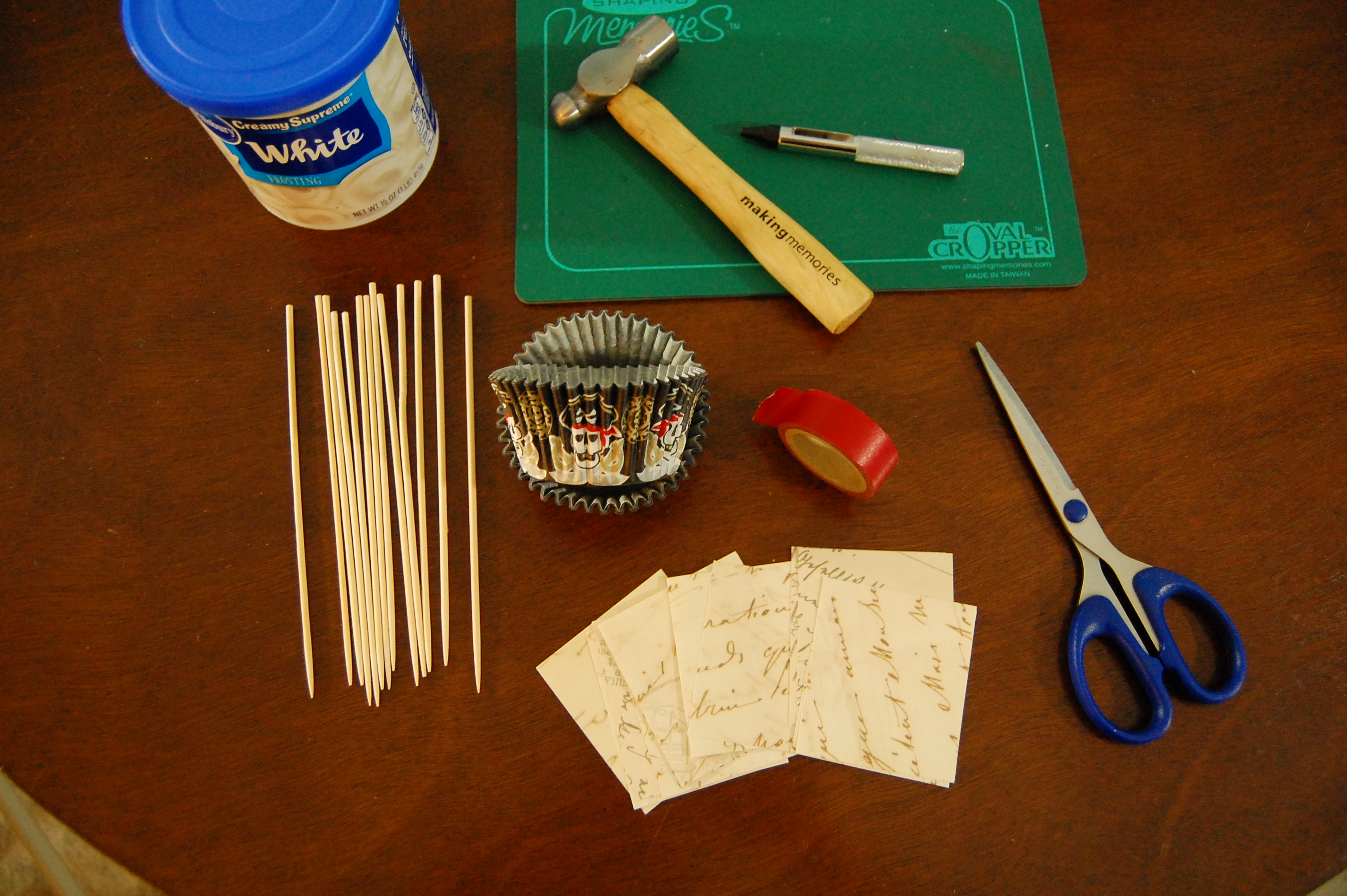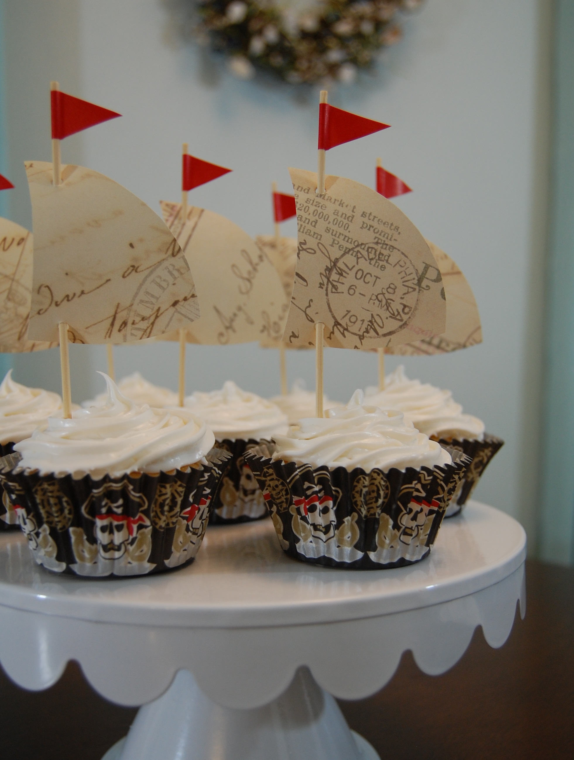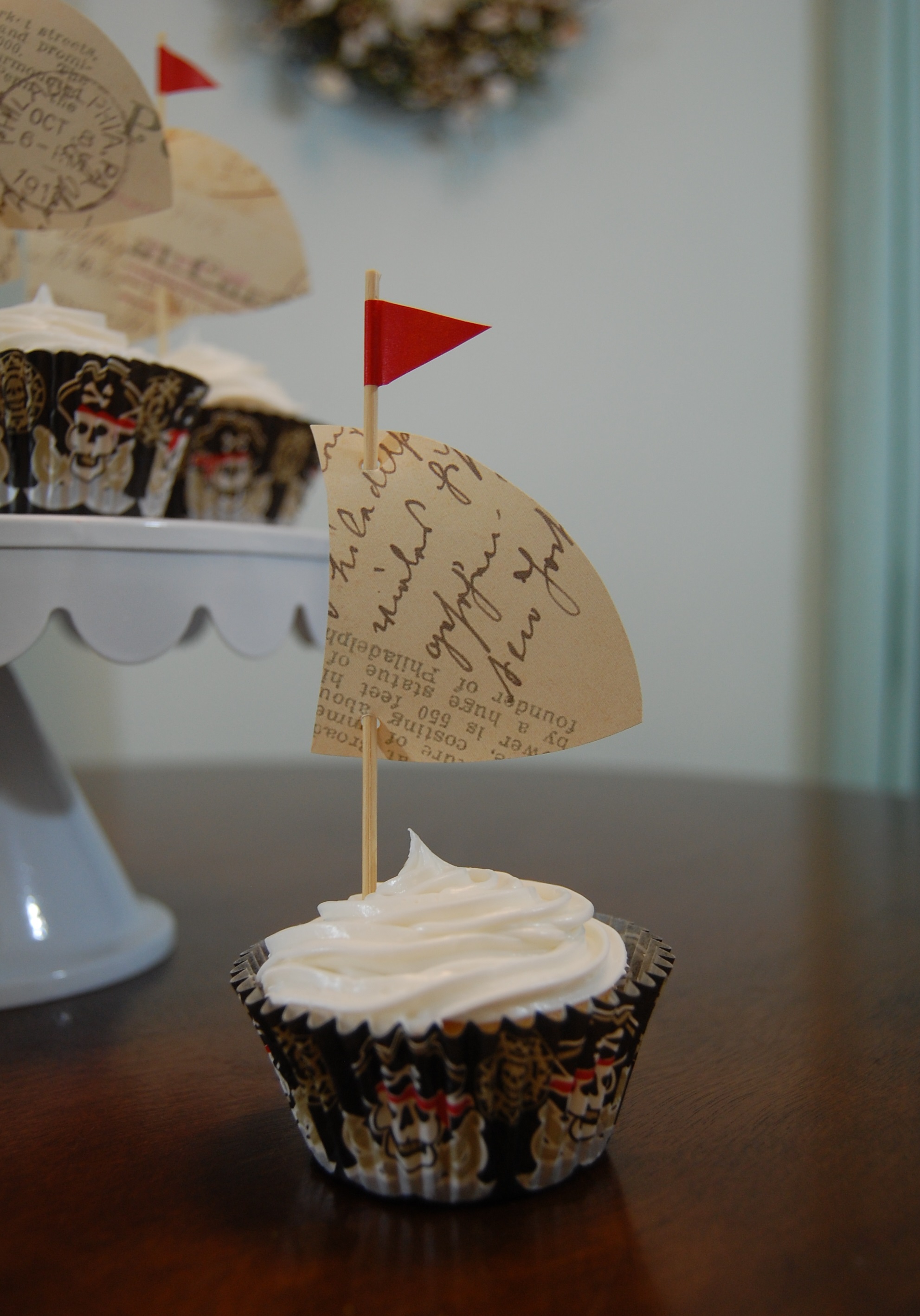 Pirate Ships Materials: Cupcakes in pirate themed papers, 6″ wooden skewers, decorative paper of your choosing, washi tape, scissors, small hole punch, (I found that a regular size hole punch was too large. If you don’t have a small hole punch, you could carefully cut slits in the sail using an x-acto knife.) pastry decorating kit with star tip
