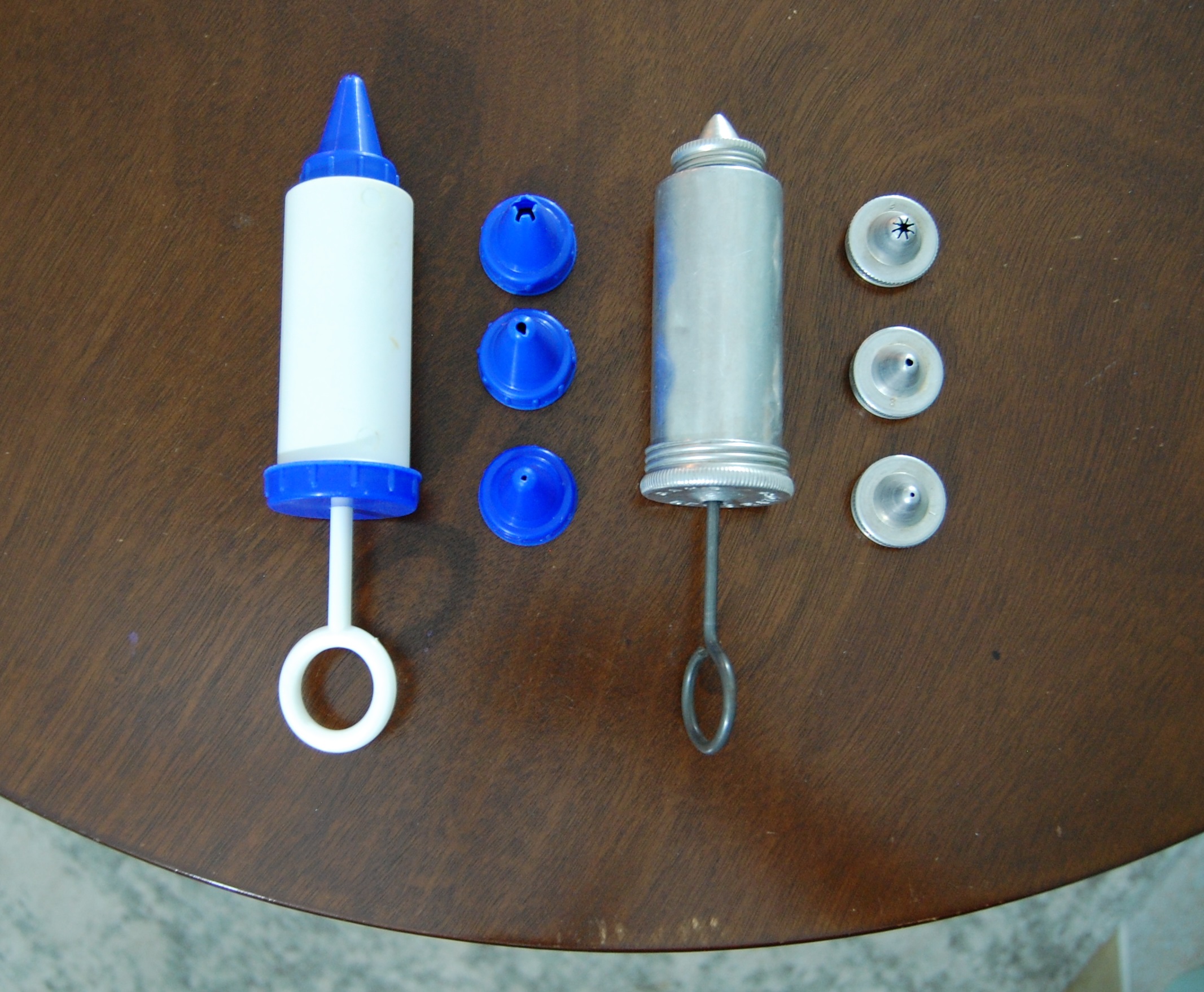 These are the pastry decorators and tips that I used. I prefer the plastic decorator over the vintage, aluminum one, because the plastic handle plunges more smoothly.