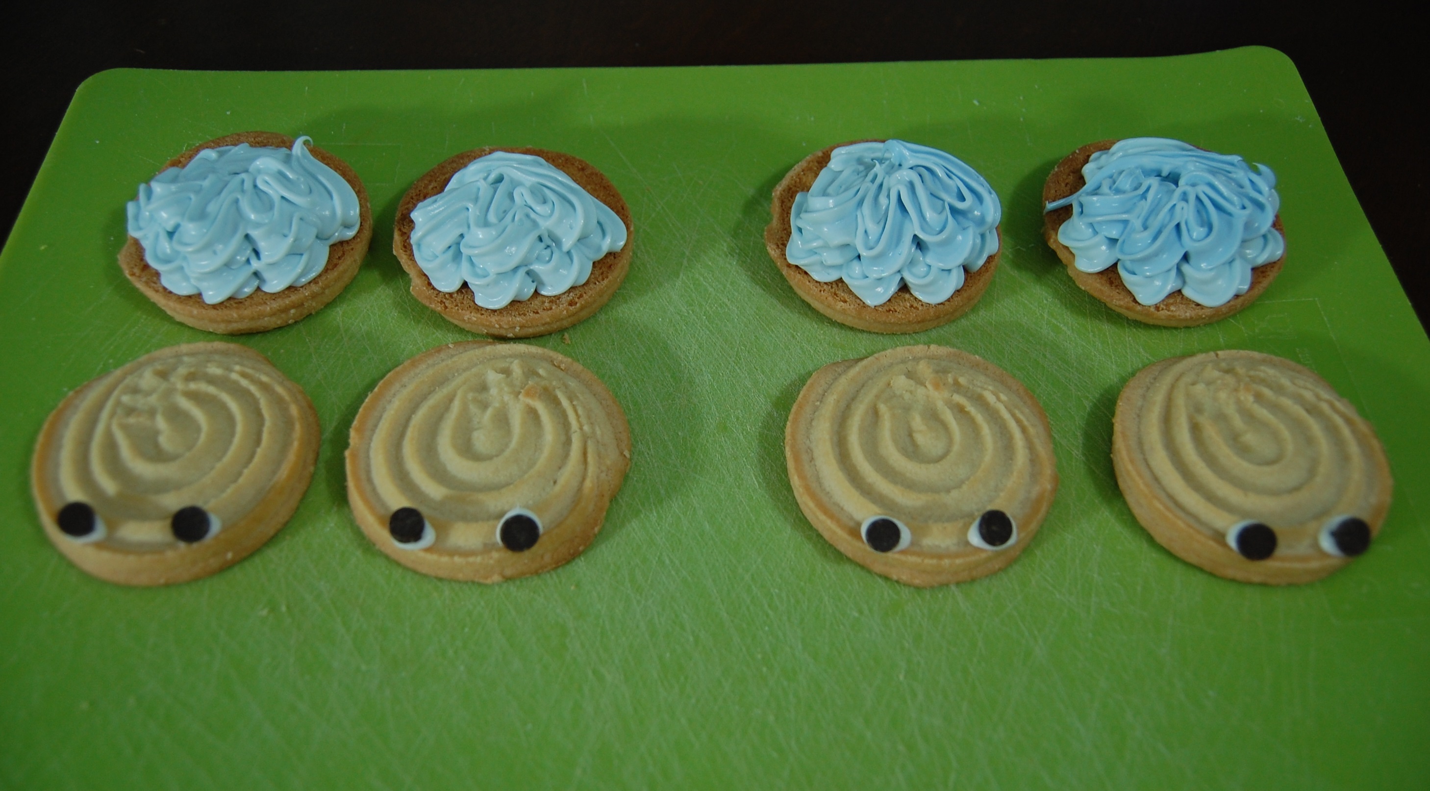 Divide the cookies into tops and bottoms. The tops will face up, and the bottoms will face down. Using white frosting and the round tip, pipe dots for eyes onto the top cookies. Press a mini chocolate chip into the frosting circles. Tint the remaining frosting pale blue. With a star tip, pipe the frosting onto the bottom cookie in waves. Pipe a second row of waves on top and a thin row of frosting along the back of the cookie.