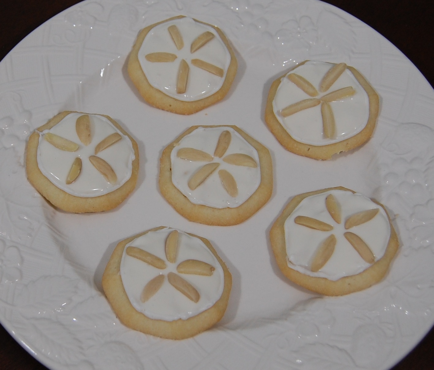 Sand Dollars Materials: Round cookies, white frosting, slivered almonds, pastry decorating kit with medium round tip, milk or cream for thinning frosting