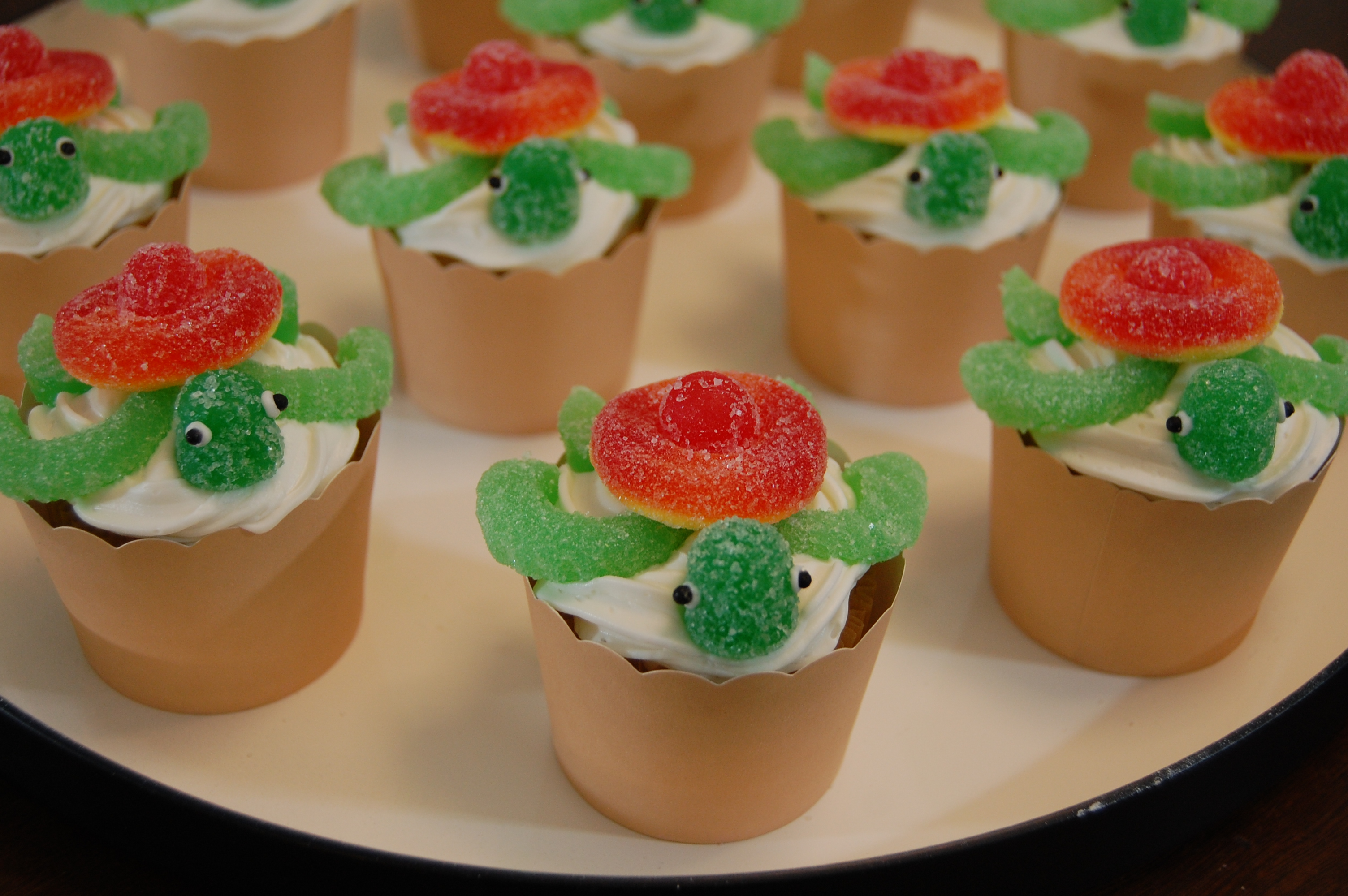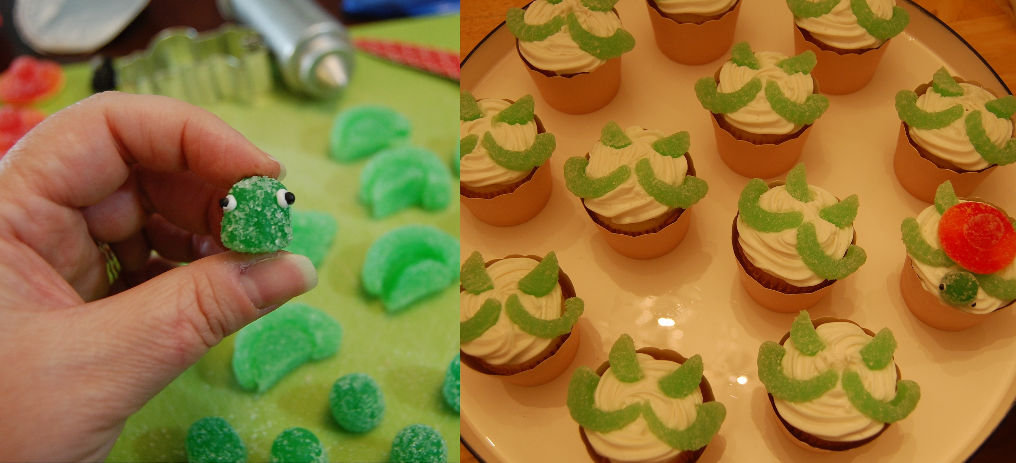 Sea Turtles Materials: Cupcakes in tan papers or sleeves (unbleached parchment papers would be great), white frosting, peach ring candies, assorted gumdrops, candy fruit slices, mini chocolate chips or gummy blackberries, pastry decorating kit with star tip and small round tip
