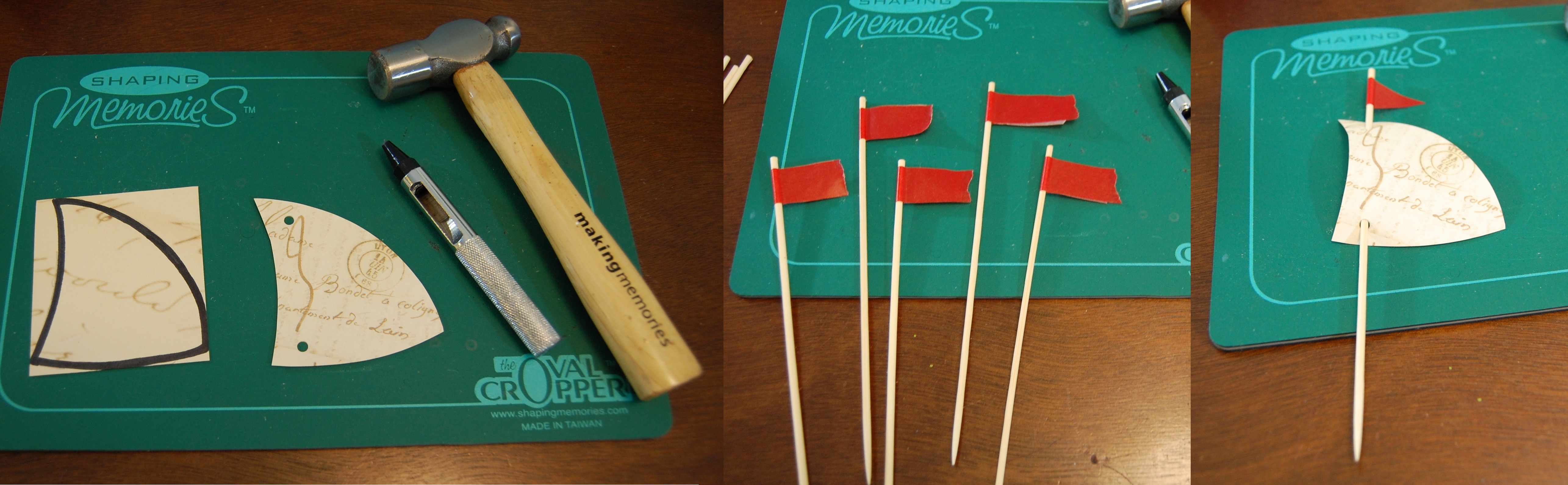 Cut scrapbook paper to 2.5″H x 2.25″W. Trim into sail shapes as pictured. Punch small holes into the sails, top and bottom. Fold washi tape over the skewer at the blunt end and press to seal. Trim the tape into triangle flags. Slide the sail onto the skewer below the flag.
