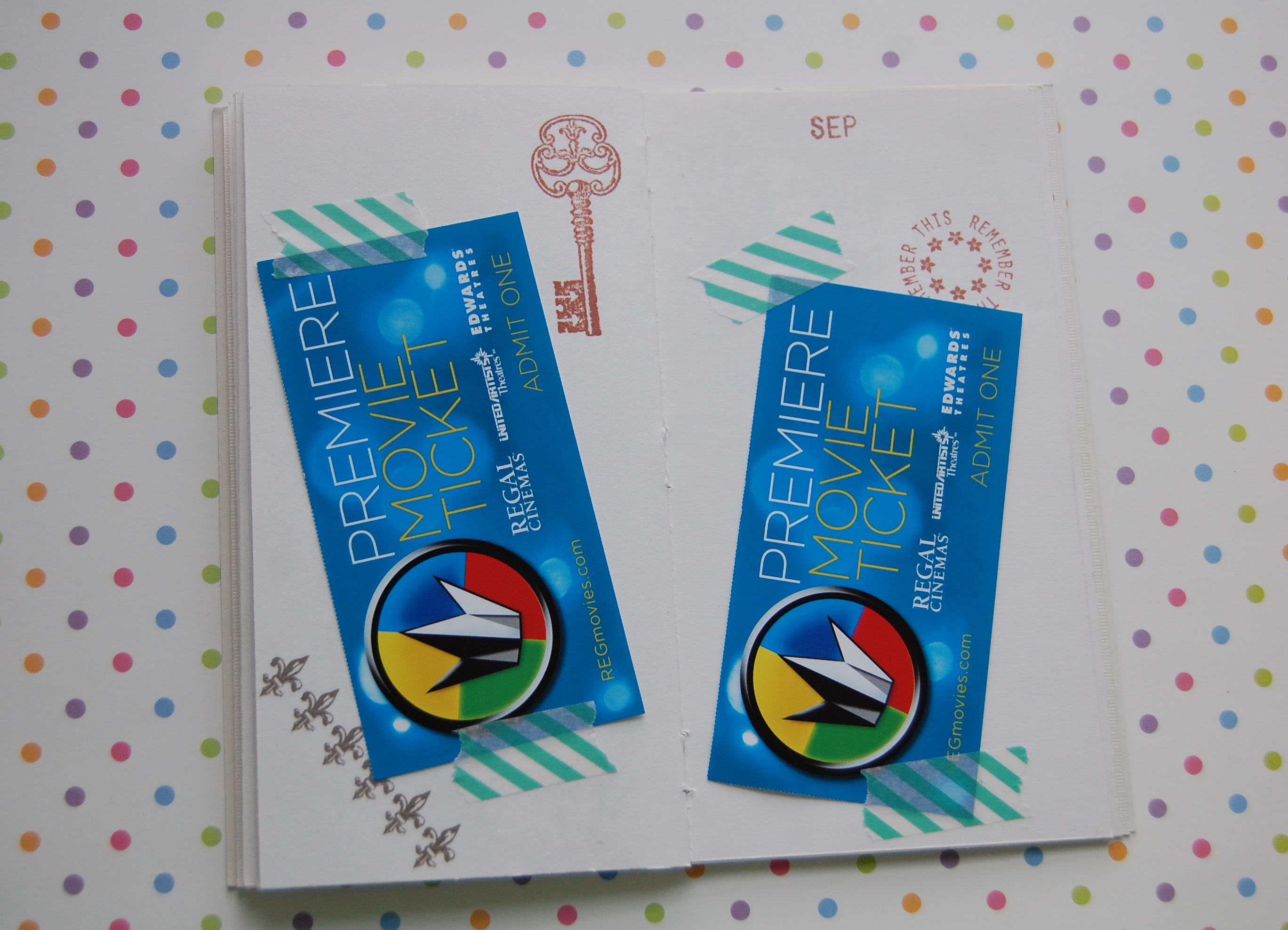 On the passport cover, add your title. I used silver stickers to spell out “Date Night” and added a small silver flourish below the title. Assemble the pages in order inside the cover and staple down the spine.