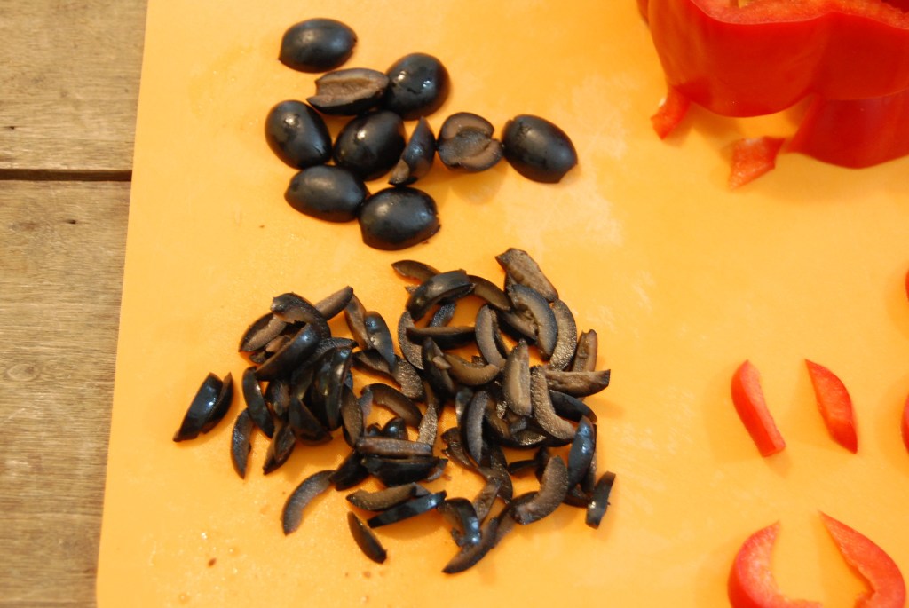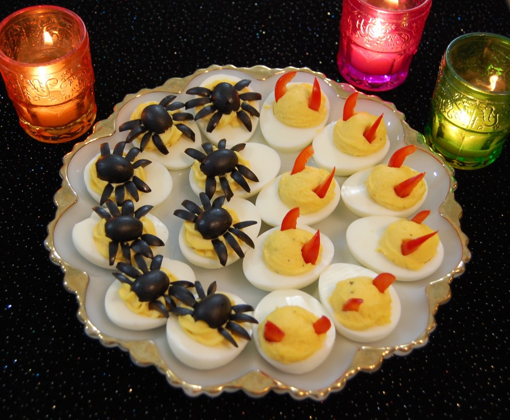 Spider Eggs For the spider’s body, slice whole black olives in half lengthwise, and place one in the center of each filled egg half. Slice tiny slivers of black olives for the spider’s legs. You’ll need eight slices for each spider. Place them around the olive half to create the spider’s legs.