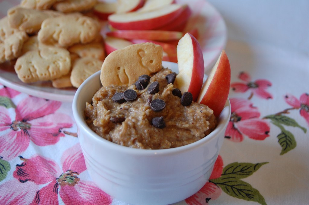 This week’s chocolate chip cookie dough dip might be one of my shining moments in real food trickery. You see, Mr. Arthur doesn’t care for chickpeas. Or so he thought. As it turns out, if you whirl them up in the food processor with a few accompaniments and a zhoosh of stevia sweetened chocolate chips, they become his new favorite food group!