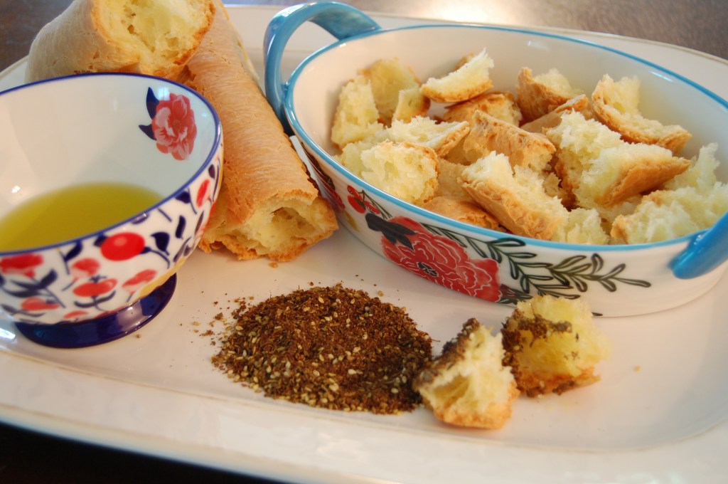 Watermelon, Cucumber slices with hummus, Za’atar Snack – New! Take dipping bread in olive oil one step further with this flavorful snack. There’s no real recipe here, just dip crusty bread in good olive oil and then lightly dip in za’atar spice and eat.