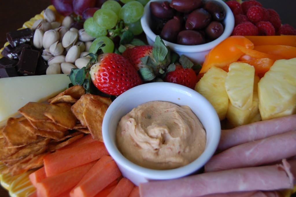 Loaded Roasted Garlic Hummus – Greek Style – New Recipe! I used the linked recipe as a starting point and took some help from the grocery store in the form of premade garlic hummus. Top with your favorite toppers, give it a zhush of olive oil and your appetizer is ready!